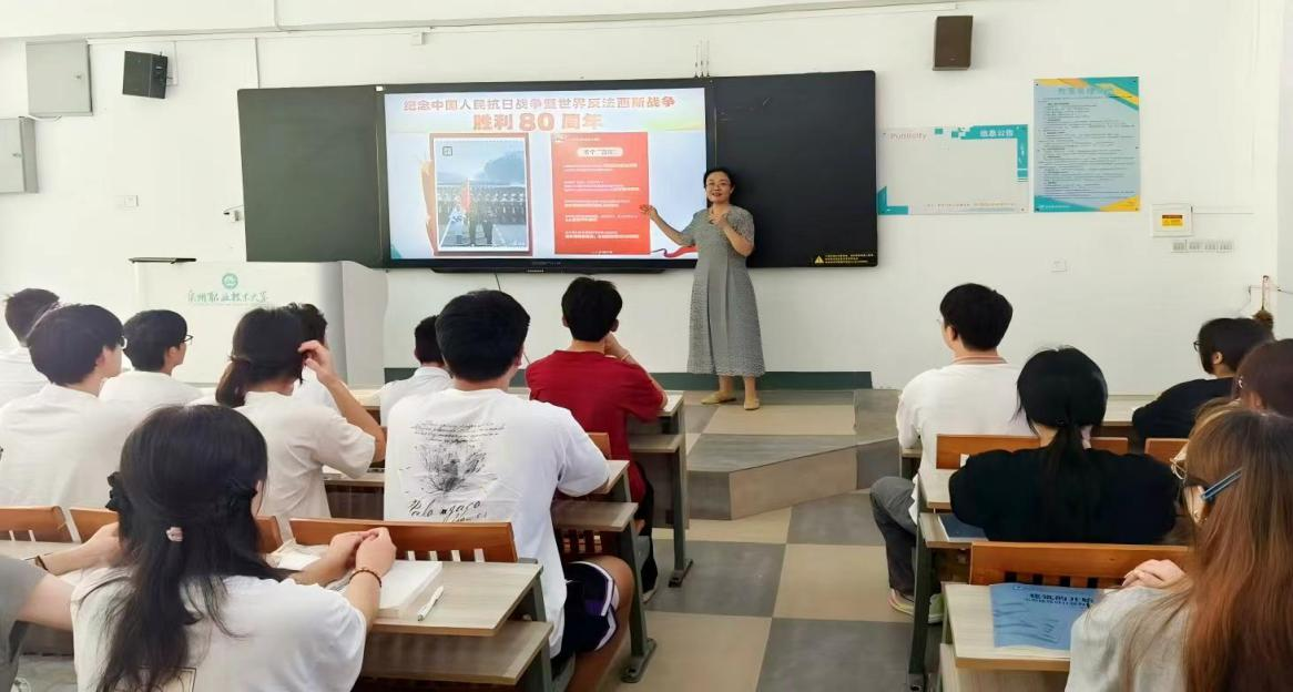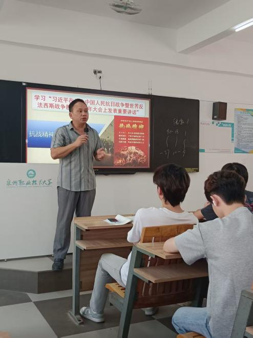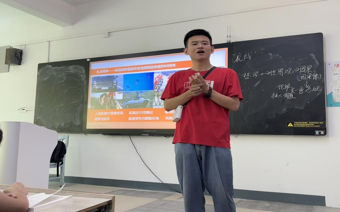 青年教师胡名志以“铭记历史·致敬英雄·砥砺青春——中国人民抗日战争暨世界反法西斯战争胜利80周年”为题进行开学第一课,重点给同学们讲述三个知识点:一是回顾抗日战争的五个重要时间节点;二是阐述胜利之日阅兵的意义何在?三是以阅兵场景中出现的抗战老兵、战旗方队引入我们应该秉持怎样的英雄观?引导学生崇尚英雄、捍卫英雄、学习英雄、争当英雄,并以其中蕴含的马克思主义群众史观、英雄史观等内容,拉近《马克思主义基本原理》这门课与学生之间的距离。