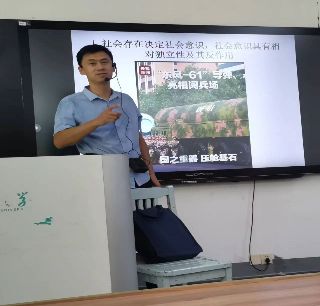 在开学第一课上,杨志强教师从“九三阅兵”战旗方队入手,着重介绍了杨靖宇支队这面战旗的历史意义,指出马克思主义认为,意识形态具有凝聚社会共识、引导行为方向的功能,战旗方队将抗战精神具象化为可感知的历史符号。这种表达方式,便抽象的精神理念转化为具体的历史记忆,增强了意识形态的感染力。从而引导学生理解伟大抗战精神的实践形态,让青年学子认识到民族复兴需要实干担当,体现了意识形态对青年价值观的塑造作用。