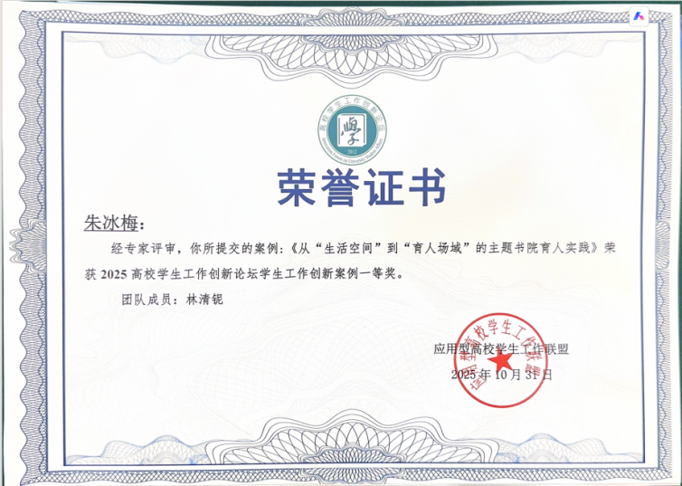 学生工作处副处长朱冰梅以《从“生活空间”到“育人场域”的主题书院育人实践》为题,分享了我校“双院制”改革的创新探索。我校以“空间重塑、机制创新、文化浸润”为核心路径,系统推动学生社区从传统生活空间向集思想引领、成长服务与文化赋能于一体的综合育人场域转型升级。各书院聚焦核心文化主题,将理念深度融入通识课程、社区活动与空间营造,构建了特色鲜明、协同互补的育人新生态,打造“一书院一特色”育人品牌。分享中,以双馨书院为典型案例,具体阐释了主题书院在文化育人层面的扎实实践与丰硕成果。此案例也荣获本次论坛学生工作创新案例一等奖。