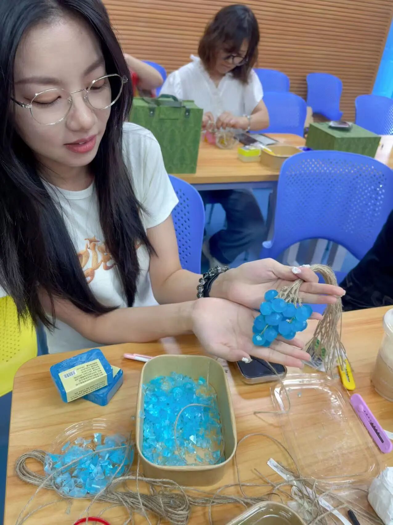 主题分享结束后,充满趣味的教师节手工体验活动紧接着拉开帷幕,三大项手工体验环节的特色项目吸引老师们参与其中:传统手工皂制作区以 “水晶葡萄香皂 DIY” 为核心,通过分层注模、细节刻画,将透明原料制成饱满剔透、兼具观赏性与实用性的香皂;青花瓷艺术画区域巧用景德镇碎瓷片,参与者经挑选、拼接、粘贴,将零散瓷片组合成含传统韵味与创意的作品,让陶瓷文化焕新;扎染艺术扇制作现场,大家借捆扎、染色工艺,让素白扇面呈现独特蓝白花纹,作品尽显传统手工艺的趣味与感染力。