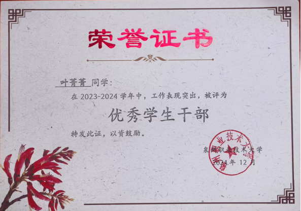 2023-2024学年获评泉州职业技术大学党委组织部优秀党务学生助理