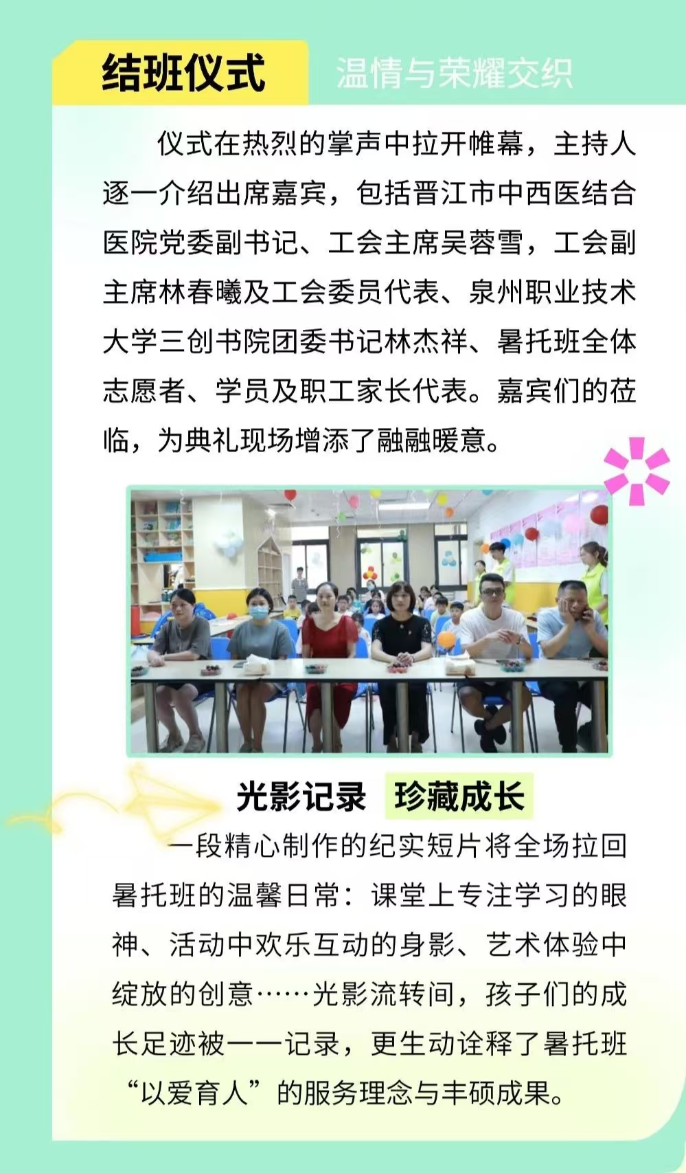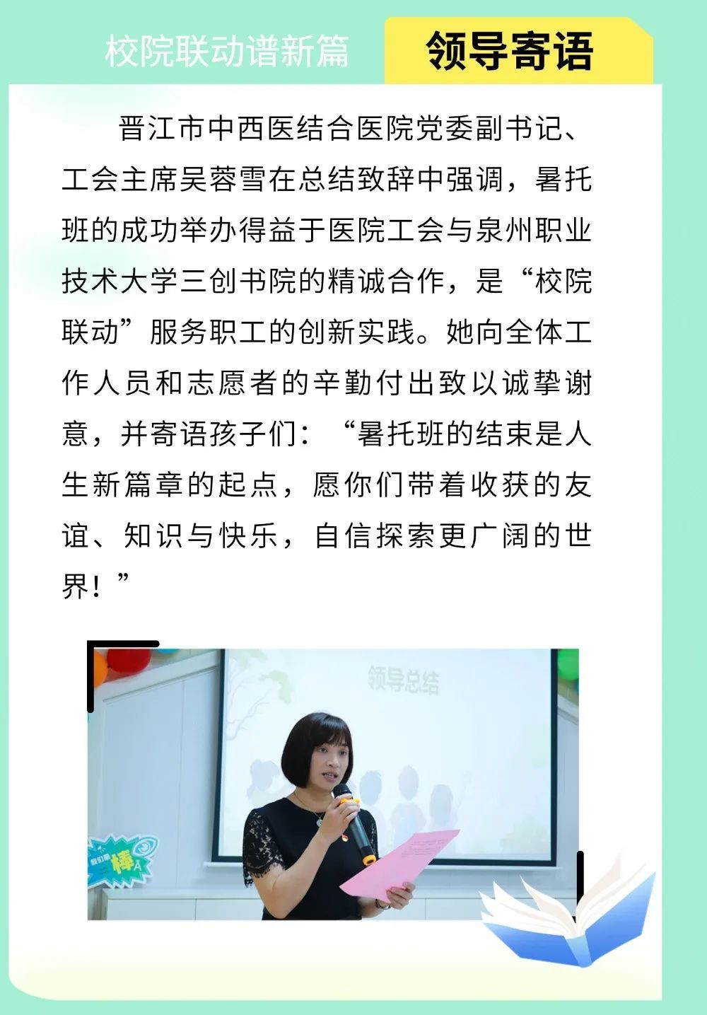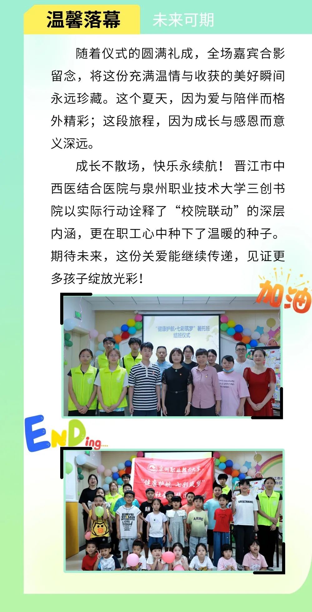 随着盛夏的蝉鸣渐远,晋江市中西医结合医院2025年“健康护航·七彩筑梦”职工子女暑托班于2025年7月31日在门诊楼圆满落下帷幕。这场由医院主办、泉州职业技术大学三创书院承办的暑期成长计划,以“校院联动”的创新模式,为职工子女打造了一个安全、快乐、富有意义的夏日乐园,更以温暖的教育实践诠释了关爱职工、护航成长的初心。