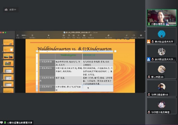 4月7日晚,在《学前比较教育》课程主讲教师泉州职业技术大学副校长兼文旅体院院长姚丹研究员、文旅体院沈芳芳老师、艺术传媒学院柯毓培老师的精心准备下,19级学前教育专业全体本科生再次实现了线上“跨洋”学习。