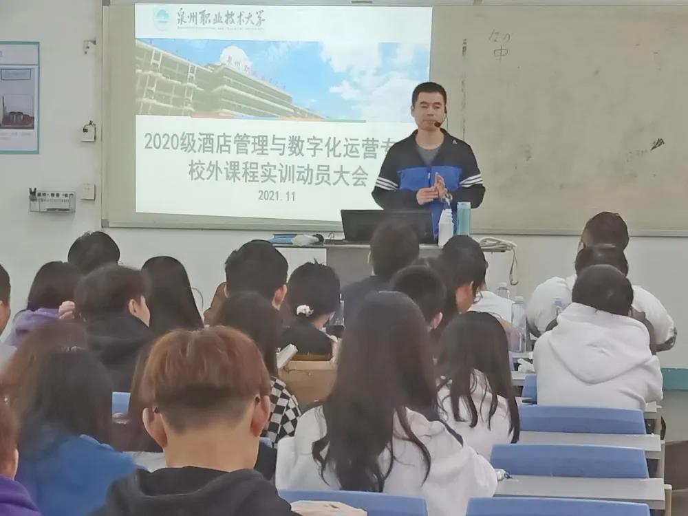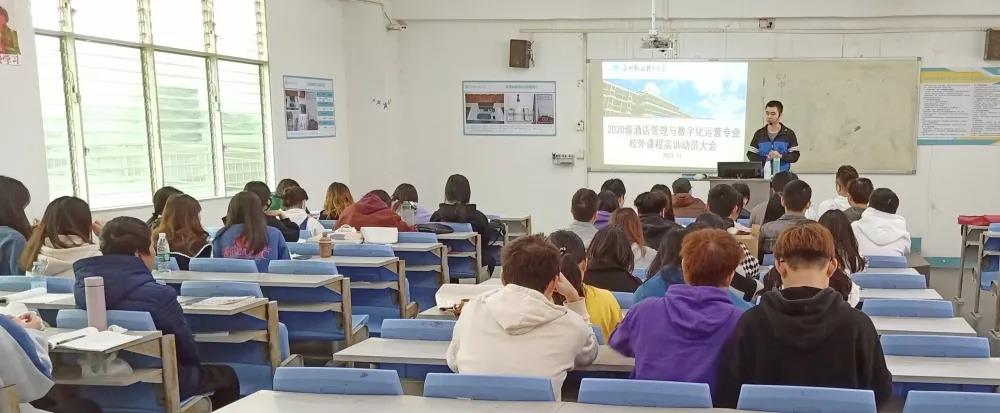2021年11月17日,酒店管理专业在教学楼A202教室举行了“2020级酒店管理专业《前厅与客房服务》校外课程实训动员大会”。本次动员大会出席的人员有:文化旅游与体育学院副院长叶城锋老师、酒店管理专业主任郑王晶老师、学业辅导员朱雅萍老师以及2020级酒店管理专业全体同学。