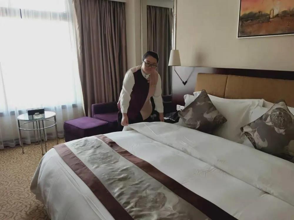 3.打扫房间时,首先,房间和厕所的垃圾需绑好装袋并放在保洁车上,然后开始撤布草,用床单把布草和拖鞋全部包裹起来,最后一并丢进消毒间内的铁窗口进行消毒。