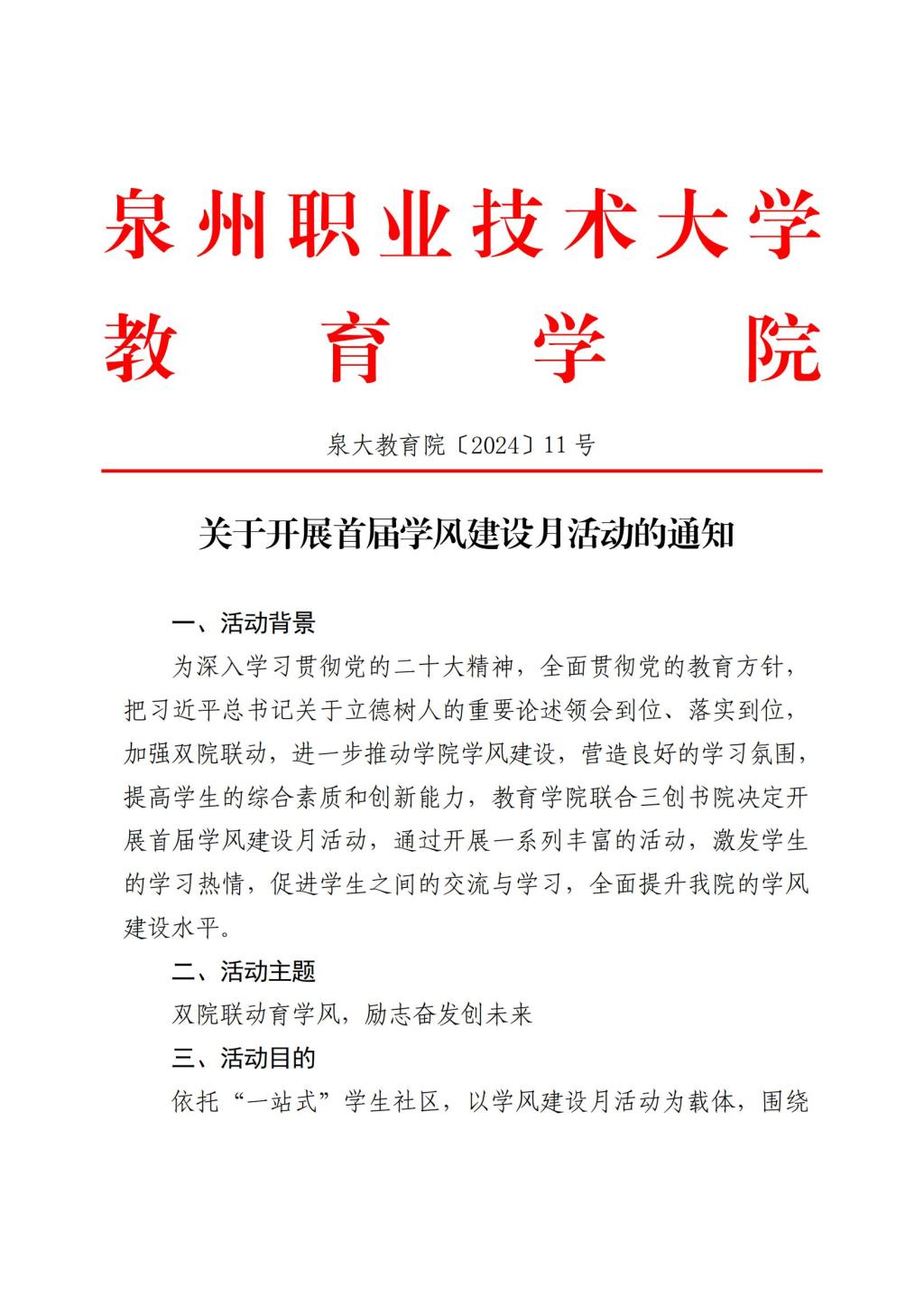 泉大教育院〔2024〕11号 关于开展首届学风建设月活动的通知