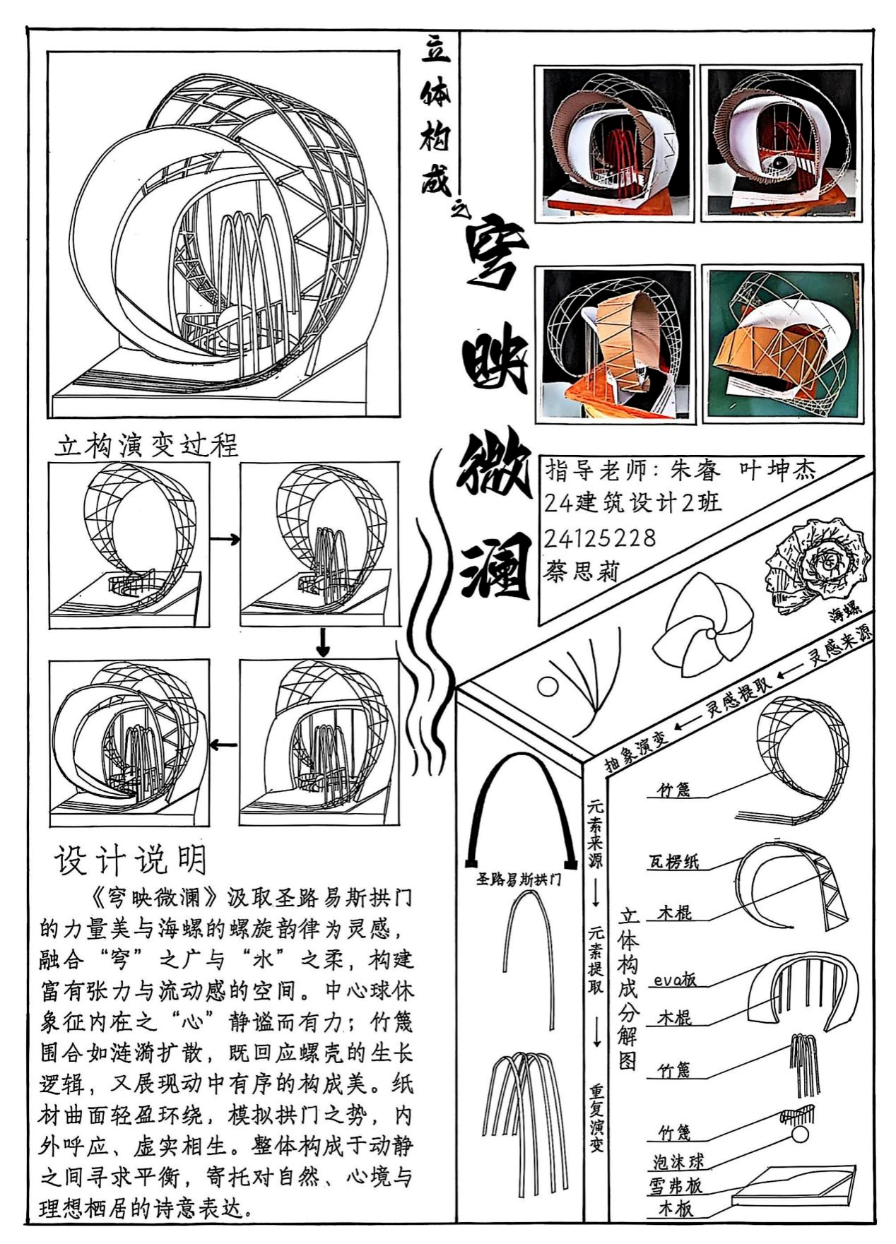 作为《建筑设计基础(II)》的教学内容,立体构成作业在关牧野、叶坤杰、柳升辉、朱睿四位青年教师指导下,在 30cm×30cm 方寸之间,锤炼建筑设计专业学生空间思维架构、造型逻辑推演、 材料语言表达等多维能力。