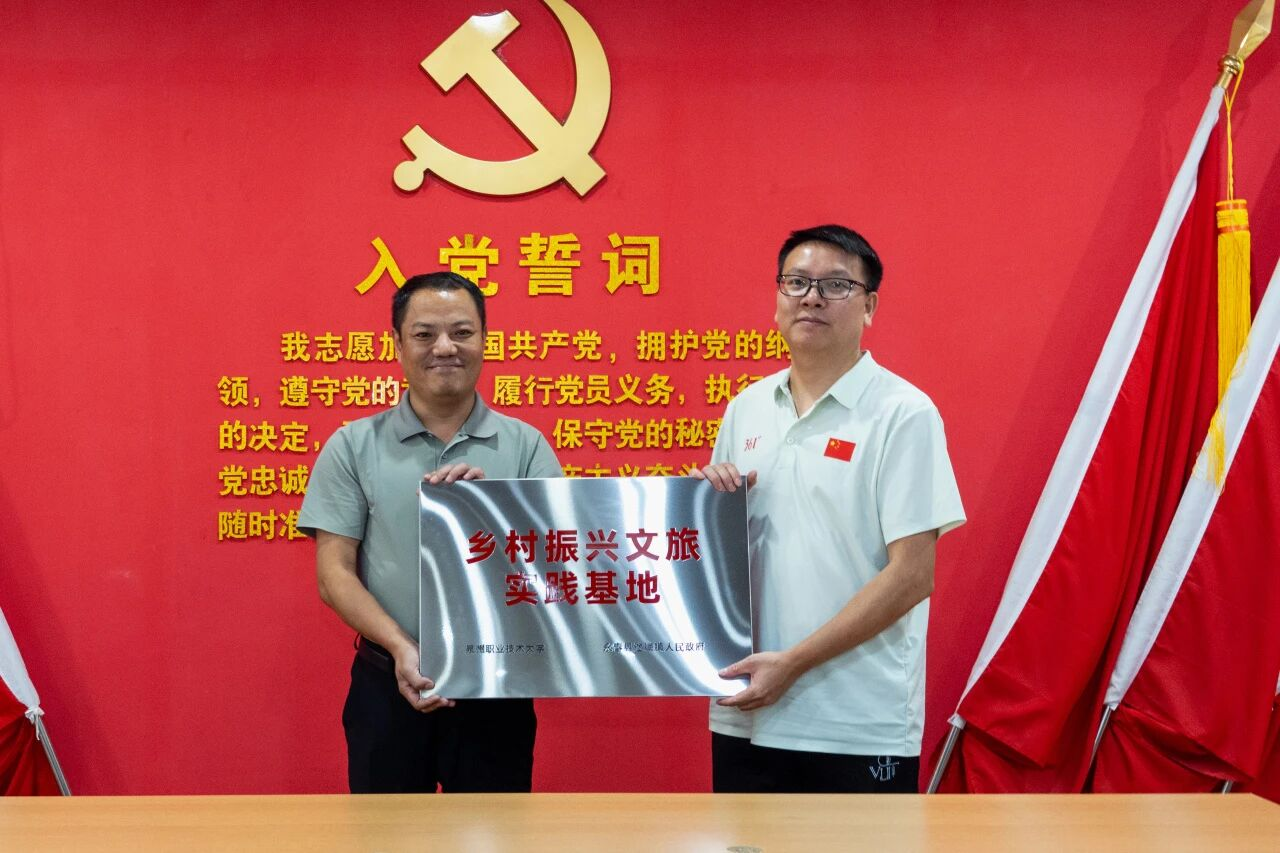 ▲ 达埔镇党委副书记、镇长梁谦杰和泉州职业技术大学副校长林文艺以及三度文创公司代表谢馥仰共同签订“乡村振兴文旅实践基地”共建协议,林文艺向达埔镇授予“乡村振兴文旅实践基地”牌匾