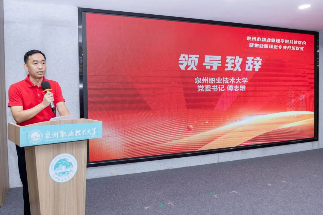 傅志雄致欢迎辞,对莅临嘉宾表示热烈欢迎,感谢社会各界的支持,并介绍了泉州职业技术大学39年来的办学成果,学校坚持“扎根晋江、服务泉州、面向福建”,坚守职业教育,已为社会培养10余万专业人才、培训30余万技能人才。学校深化产教融合,与龙头企业共建产业学院,开展国际合作,拥有多项国家级、省级基地资质。他强调,此次泉大与泉州市住建局共建物业管理学院,正是响应泉州市委市政府“社区物业服务管理提升三年行动”的主动作为,也是学校深化产教融合、服务城市治理现代化的创新实践,旨在应对智慧城市建设中物业数字化转型与人才升级挑战。泉州市物业管理学院的成立具有三重价值:一是打造政校协同新范式,通过住建局政策指导与高校教育资源整合,打造“政校共建”的物业管理人才培养高地;二是打造行业升级新引擎,学院将聚焦“智慧物业”“绿色社区”等前沿领域,为行业输送懂传统服务、掌握物联网、大数据技术的复合型人才;三是成为民生服务新支点,通过微专业专班、企业定制班等灵活形式,快速填补泉州物业行业的人才缺口,助力“美好社区”建设。