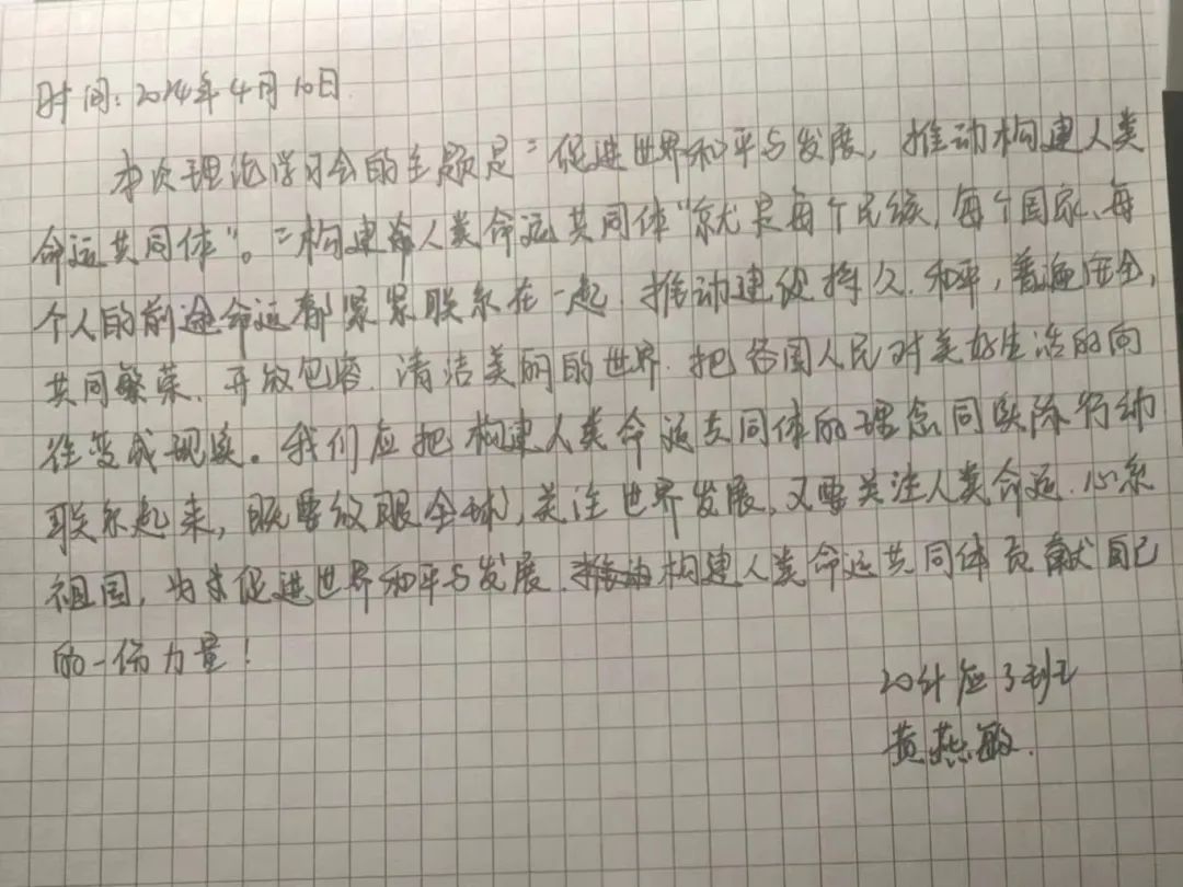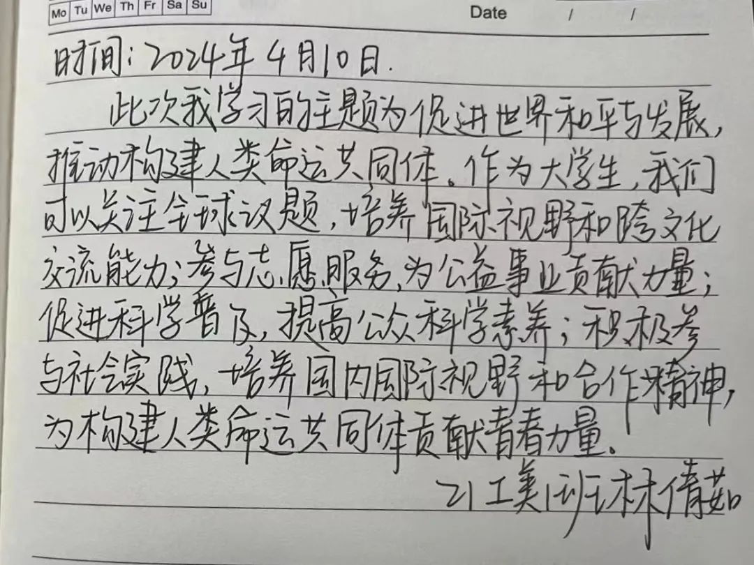 今日的理论学习会中,我深刻体会到世界人民的命运联系的愈加紧密,只有通过加强合作、实现共同发展,才能有效应对全球性问题和挑战,构建人类命运共同节成为各国间进行合作的共识。作为青年大学生,我深感到增进人类福社、实现可持续发展的重要性。以和平合作作为引领,才能实现共同发展和进步。