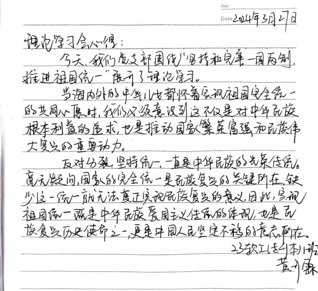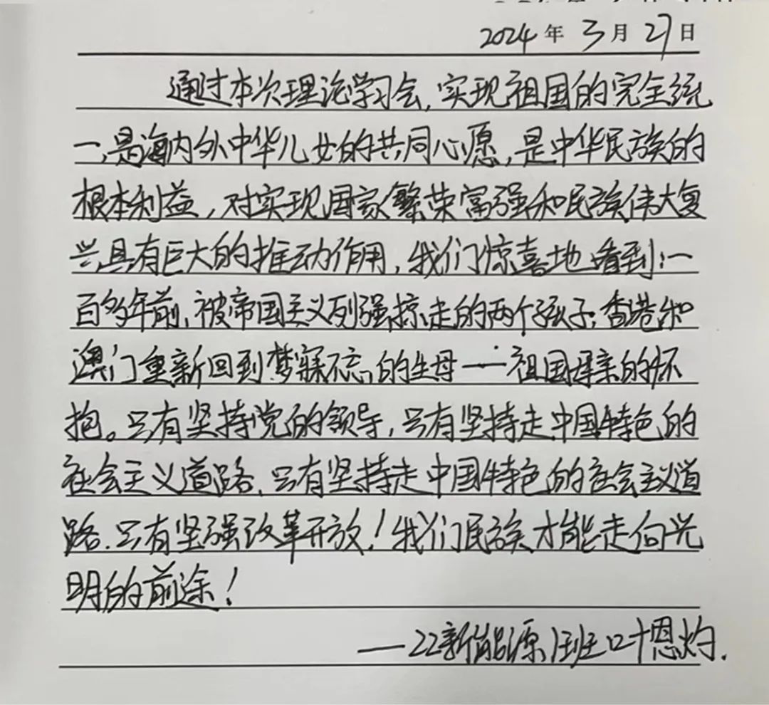 本次理论学习会的主题是:坚持和完善“一国两制”,推进祖国统一。“一国两制”是国家的一项基本国策,推进“一国两制”事业,必须牢牢把握其根本宗旨。无论遇到什么样的困难,什么样的挑战,我们对“一国两制”方针的信心和决心都不能动摇。我们要自觉强化“一国两制”使命担当,要自觉站在国家整体利益的主场上思考问题、解决问题。我们明白国家统一是中华民族走向伟大复兴的历史必然、实现中华民族伟大复兴是近代以来中华民族最伟大的梦想。