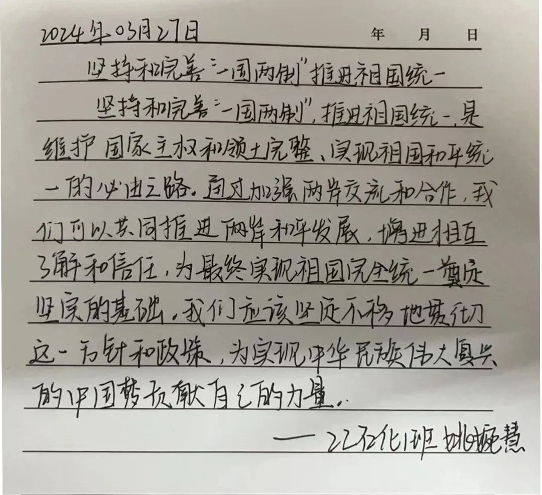 通过这次学习,学生党员们加深了对“一国两制”和祖国统一重要性的认识,以此帮助个人树立正确的政治立场,增强爱国意识和民族自豪感,培养遵纪守法的意识,为实现中华民族伟大复兴贡献力量。