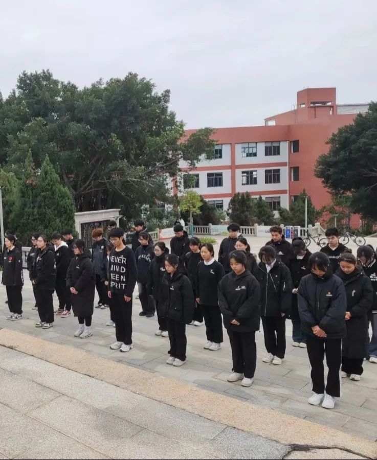 国歌体现了国家精神和民族情怀,增强了爱国意识和民族凝聚力。奏唱国歌是对国家和自我的最直接、最有力量的认同方式。默哀环节中,四实学子向南京大屠杀遇难同胞致哀,传承先烈的爱国精神,为祖国繁荣富强贡献自己的力量。默哀后,22级新能源1班叶恩灼同学代表全体同学在纪念碑前进行了献花仪式。缅怀过去,反对战争,珍爱和平。四实书院团委学生副书记罗欣随后发表了讲话,介绍了国家公祭日的历史与意义。当代青年理应勿忘历史,积极向前看待未来,携手前行,为祖国的明天共同努力。