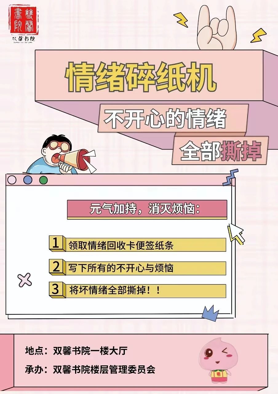 同学们可以通过参加活动,丢弃自己的坏情绪与烦恼,书写美好祝福。参加活动后可以进行转盘抽奖,本次活动奖项设为一等奖,二等奖,三等奖以及参与奖。双馨书院楼层管理委员会为大家准备了精美的奖品,让每个同学在释放自己的情绪压力后,都能收获一份喜悦。奖品数量有限,先到先得哦~