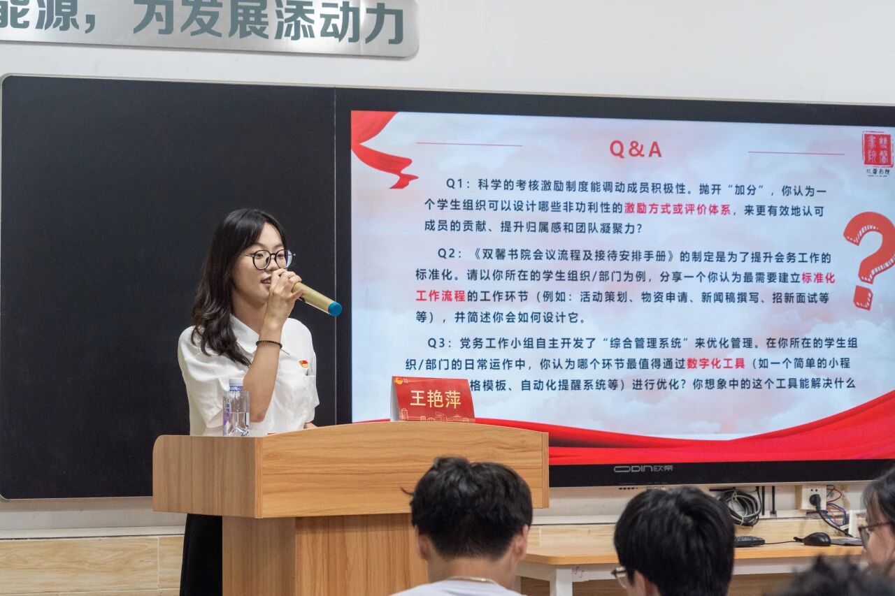王艳萍老师以学生组织工作规范化与思想引领力双提升路径为以为核心,先介绍了党务工作小组组织的构成,涵盖组委会、纪要归档部、培训发展部、实践行动部、理论学习部、信息技术部、调研宣传部,各部门分工协作,共同推进党务工作。随后从工作规范与建设、思想引领力提升两大方面深入阐述,设置问答环节,探讨非功利性激励方式、标准化工作流程设计、数字化工具优化等问题。在最后以“双提升模型”总结,强调通过规范化夯实基础、提升效率,进而彰显价值、赋能成长,增强引领力。此次分享让大家对党务小组工作有了更清晰的认识,也为学生组织工作提供了新思路。相信在规范开展工作与强化思想引领下,能更好地推动相关工作,助力学生成长与组织发展。