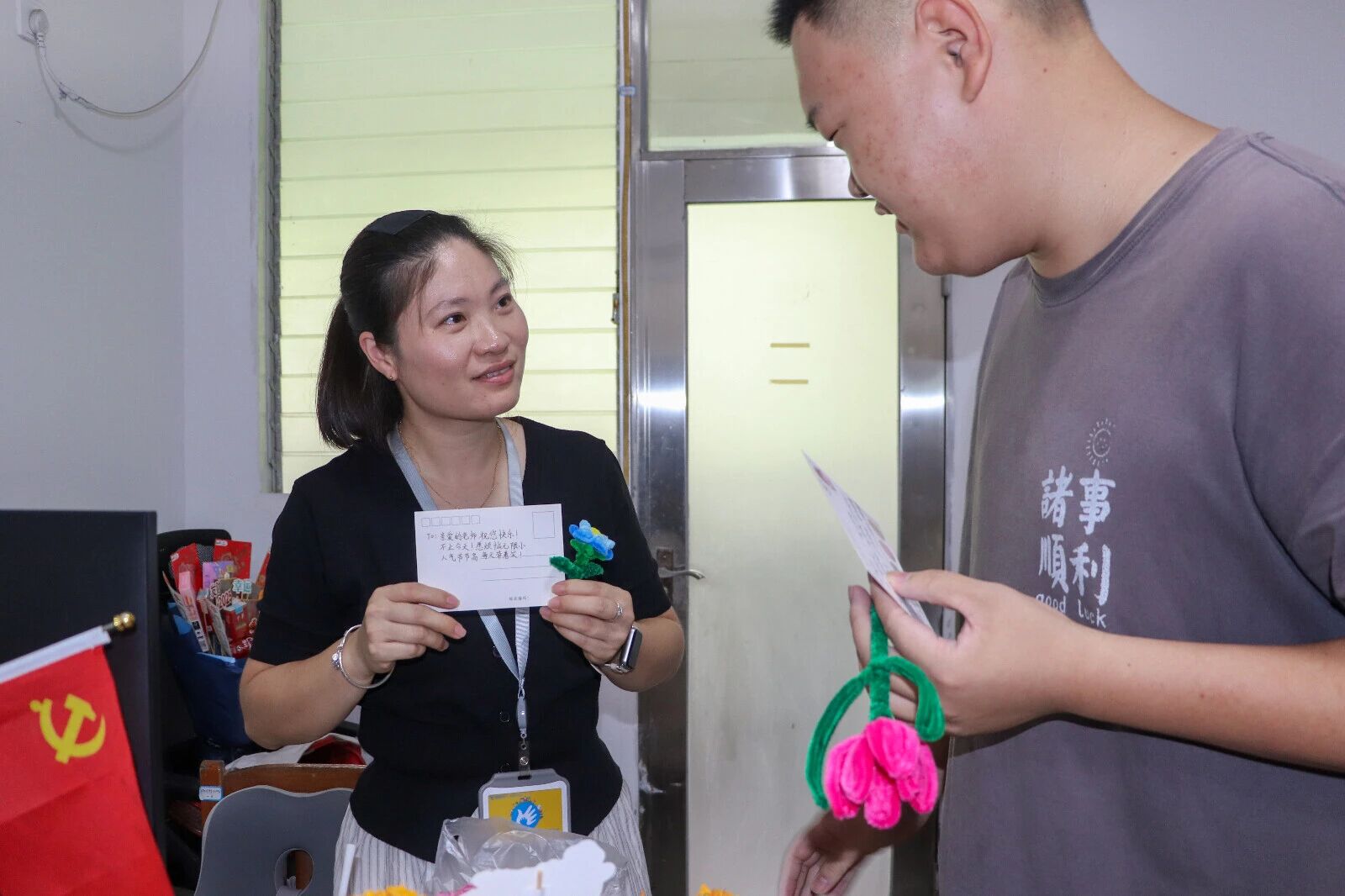 同学们用扭扭棒制作花朵,在贺卡上书写心里话,将心意融入手作礼物,老师收到时,眼里满是笑意与感动。