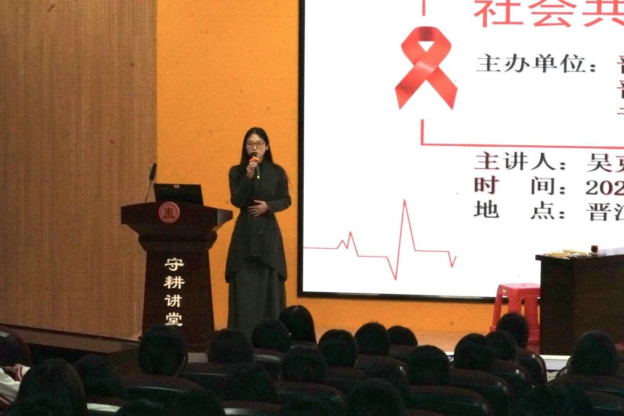 随后,泉州职业技术大学双馨书院“为爱而生”防艾宣讲团的宣讲员吴克群带领现场的同学们系统梳理了艾滋病的核心知识要点,为健康的校园生活增添重要保障。