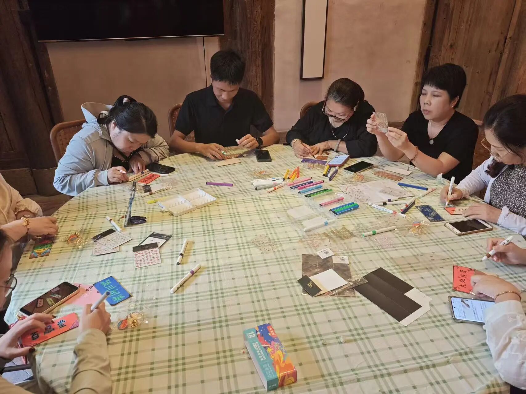 为了提升参与者的沉浸感与互动性,本场活动精心设计了郡望堂号冰箱贴手工制作环节。活动现场,工作人员提前准备了制作冰箱贴所需的材料包,同时还特意制作了“百家姓郡望堂号对照表”展示板,详细列出了常见姓氏对应的郡望堂号,方便参与者查询参考。拿到材料后,大家迅速投入到创作中,现场氛围轻松愉悦,整个同心会客厅充满了浓浓的文化气息与温馨的互动氛围。