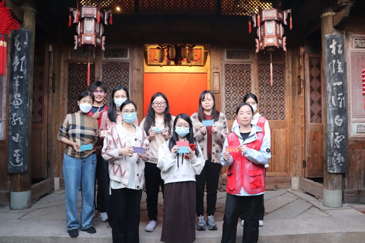 志愿者们围绕“堂号”展开引导:先帮游客确认自家姓氏对应的郡望堂号,比如为一位台湾同胞找到其家族“济阳蔡氏”的堂号参考;再协助大家挑选磁贴、调配颜料,手把手指导篆体堂号的勾勒技巧。有人专注复刻卡片上的传统堂号字体,有人则即兴添加简单线条装饰,原本空白的木板,渐渐成为承载家族符号的“迷你文化载体”,现场色彩与笑声交织,充满温情。