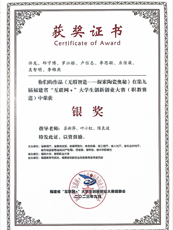 2023年8月 福建省“互联网+”创新创业省赛“银奖 ”;