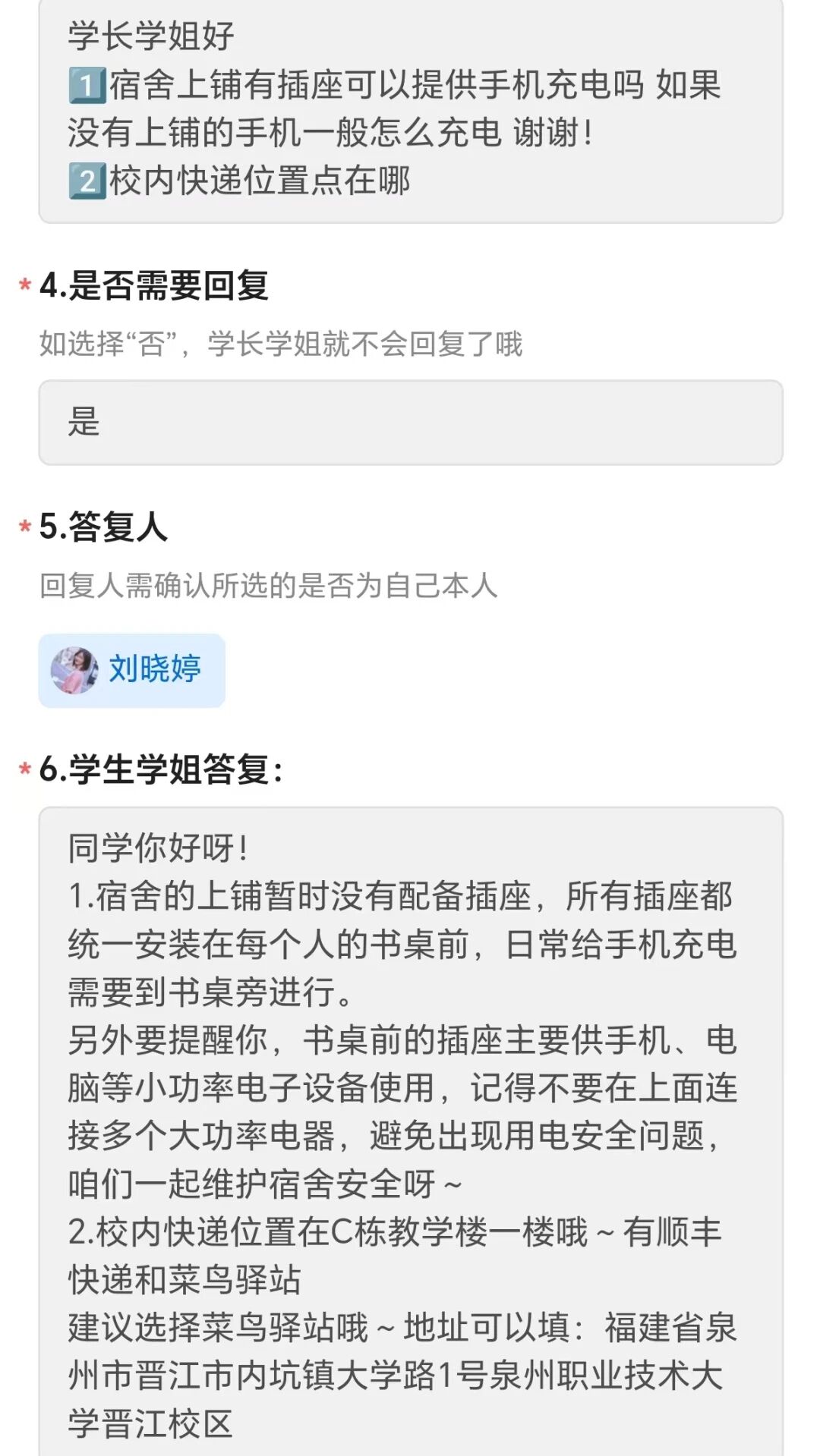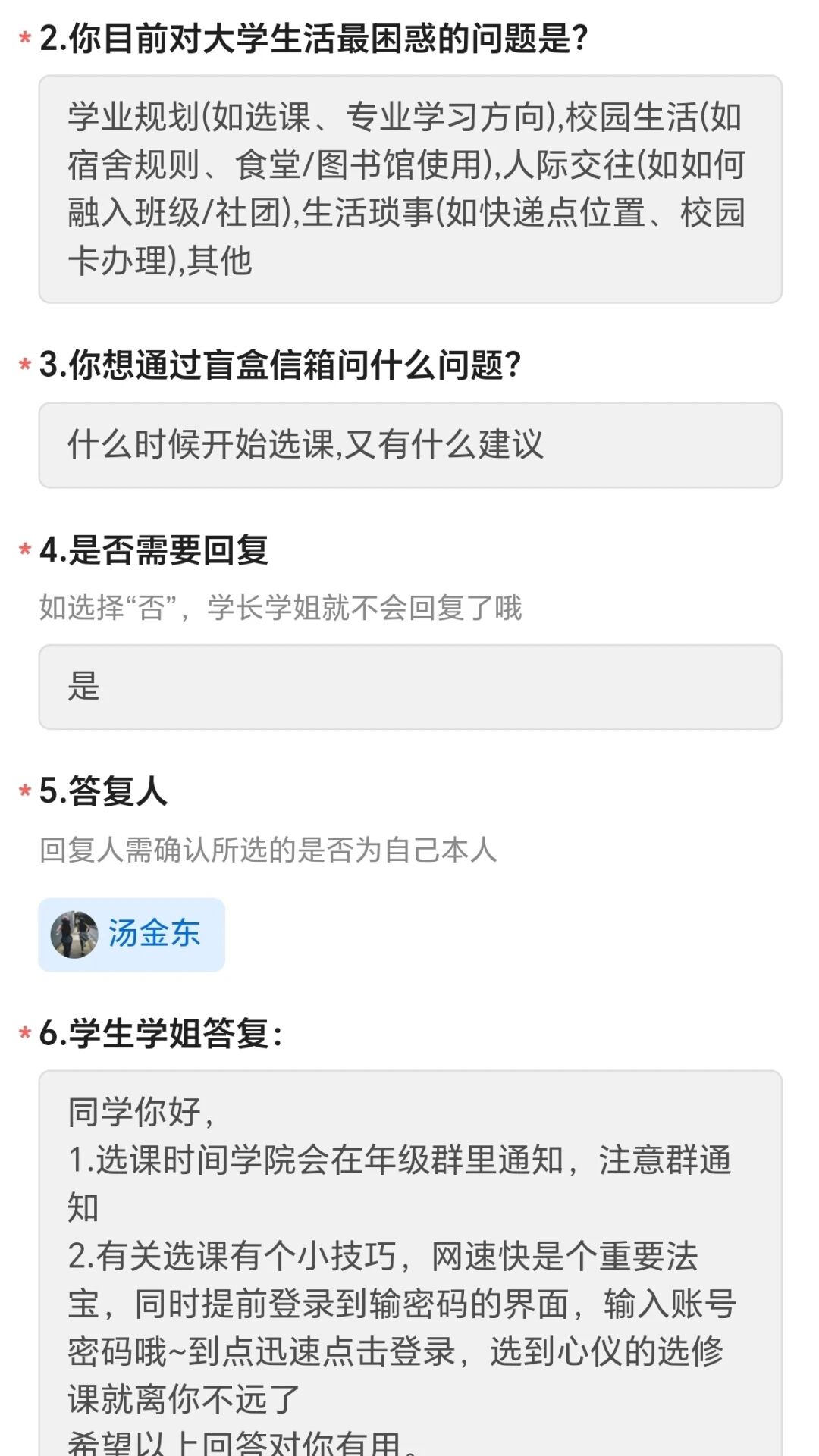 为切实解决新生入学困惑,校学生会推出“新生盲盒信箱”服务,吸引238名新生投稿咨询。针对校园生活(如书院床铺尺寸、宿舍用电功率)、学业规划(如专业课与选修课范围)、生活琐事(如快递点位、校园网使用)等疑问,校学生会成员逐一耐心回复,用“一对一”精准服务为新生搭建融入校园的“快速通道”。