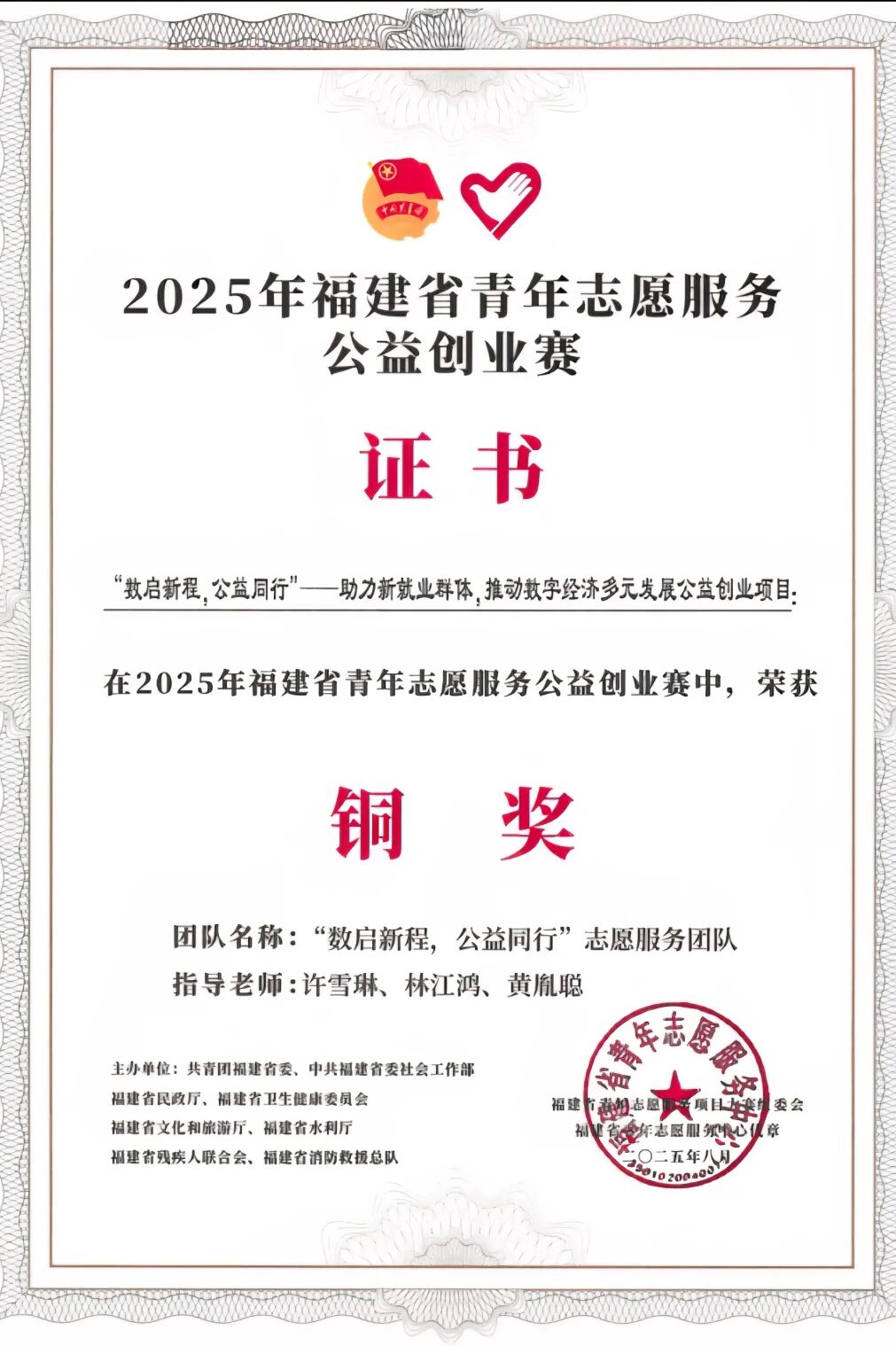 2025年08月 福建省青年志愿者服务中心 2025年福建省青年志愿服务公益创业赛“铜奖”;