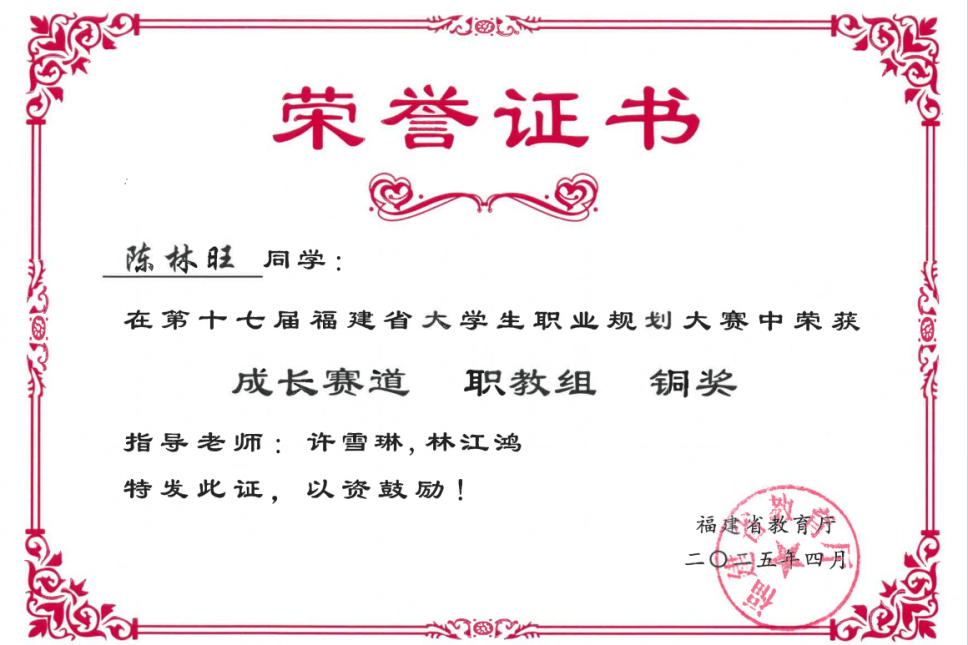 2025年04月 福建省教育厅 第十七届福建省大学生职业生涯规划成长赛道职教组“铜奖”;