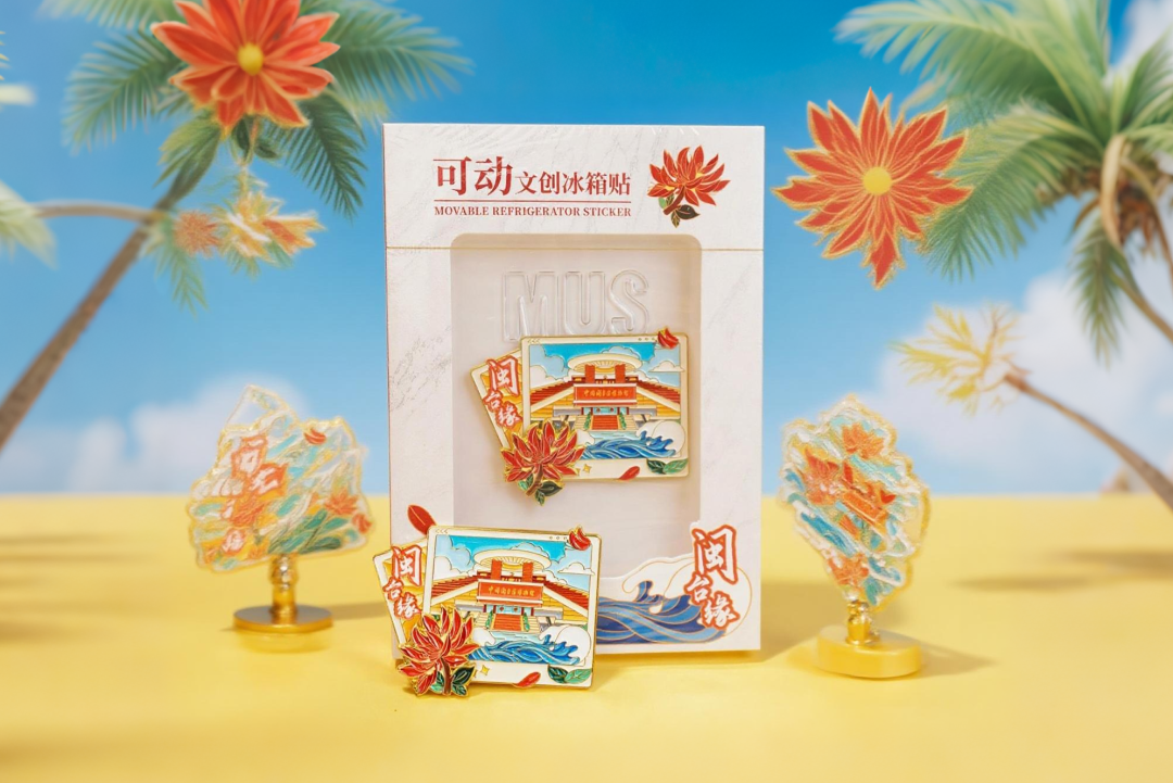 在两场“博物馆预览”直播中,主播廖同学与闽台缘志愿讲解老师雪伦默契配合,沿展厅陈列顺序从远古时期的台湾海峡古菱齿象化石,到明清时期的迁台路线图,再到抗日时期的台湾少年团史料,层层深入讲解闽台同源的历史脉络,还通过“体验渡海VR场景”、“近距离展示铁钟纹饰” 等环节打破时空限制,让观众沉浸式感受文物背后的故事,其中 7 月 31 日的直播表现尤为亮眼,曝光量达4272人,评论人数205人,新增粉丝 108 人,多项数据远超同级别文化类直播,成为平台内“文博云游”的优质案例;而在两场“文创分享”直播中,团队聚焦博物馆文创产品的文化内涵,从德化白瓷玉漱公主冰箱贴的珐琅工艺,到“同文同种同根生” 爆破画冰箱贴的木质肌理,再到“事事如意”纪念章的吉祥寓意,细致解读文创产品与文物、民俗的关联,同时创新设计 “观众点单讲解” 环节,根据弹幕需求优先介绍热门产品,搭配打卡套装视频展示,让文创成为传递闽台文化的 “便携载体”。