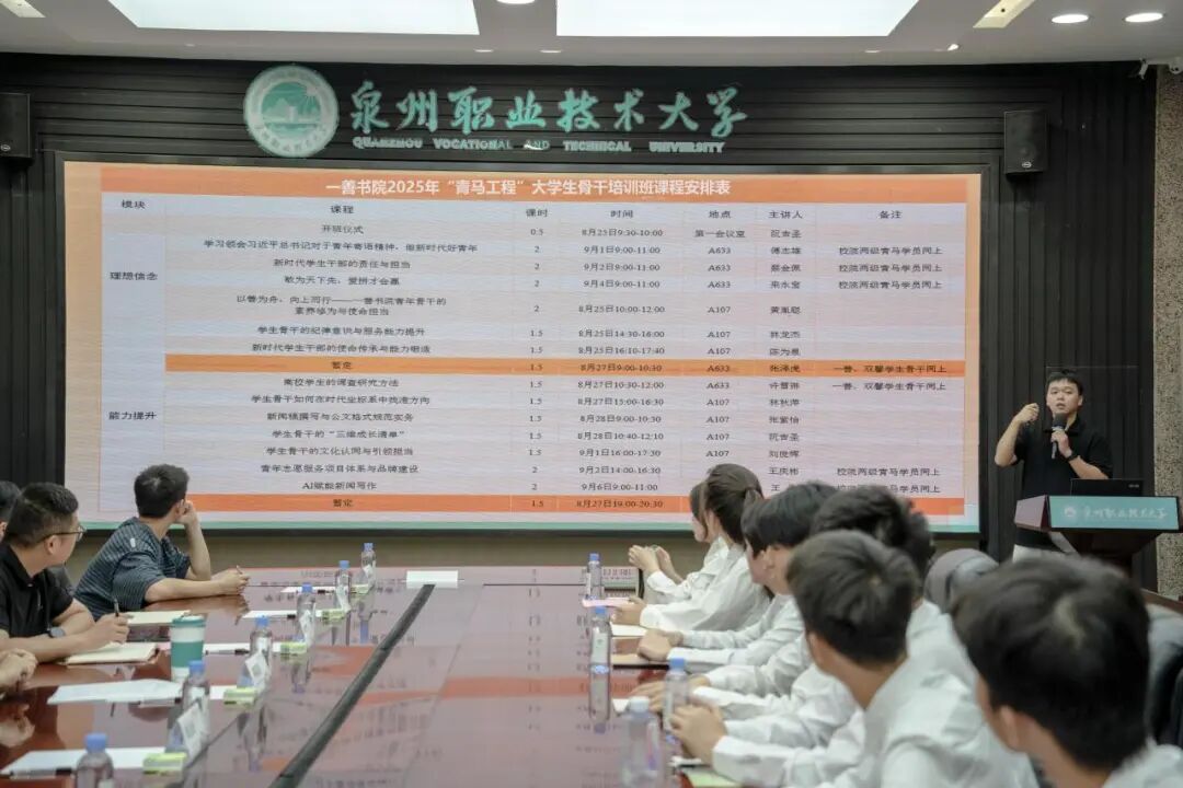 一善书院团委负责人阮吉圣老师详细介绍了本次培训班的课程安排及考核方式。他明确,本次培训以“理论学习 + 实践锻炼 + 综合考察”为核心模式,并结合一善书院“向上向善”的育人内涵设计内容,涵盖专题讲座、红色研学、实践实习等多个维度,旨在帮助学员切实提升政治素养与服务意识,为后续开展团学工作、服务师生打下坚实基础。
