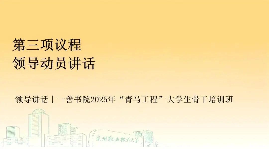 本次一善书院2025年“青马工程”大学生骨干培训班开班仪式至此圆满结束!未来,一善书院全体青年学生骨干将始终践行书院“向上向善”的育人理念,以昂扬姿态投入学习与实践,努力成长为有理想、敢担当、能吃苦、肯奋斗的新时代青年骨干,为书院“善文化” 传承、学校发展与青年工作贡献青春力量。