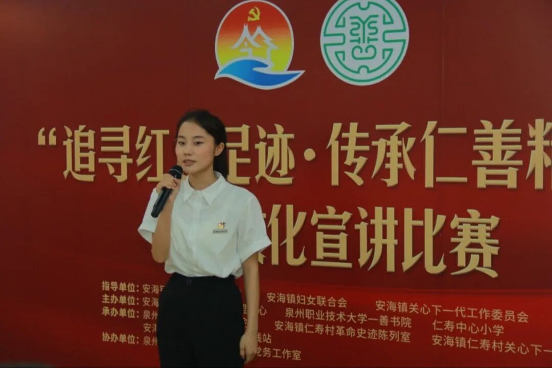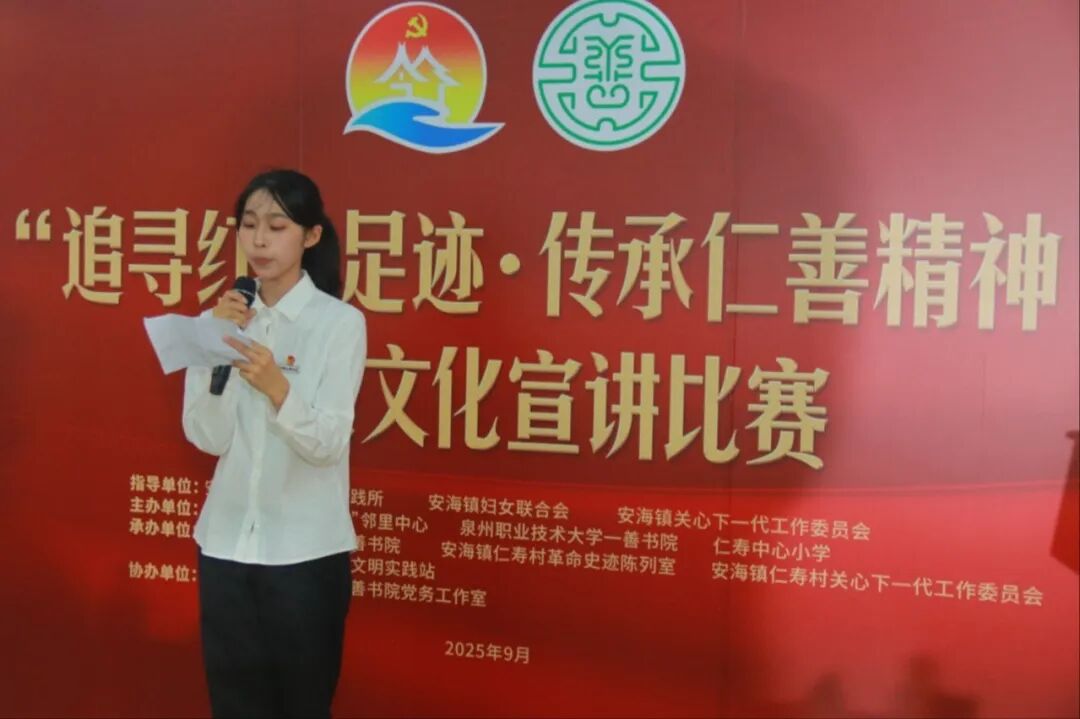 为深入贯彻落实习近平新时代中国特色社会主义思想,用好红色资源、传承红色基因,2025年9月17日下午,“追寻红色足迹・传承仁善精神”红色文化宣讲比赛决赛在晋江市安海镇仁寿村成功举办。本次活动由安海镇仁寿村“党建+”邻里中心、泉州职业技术大学一善书院、仁寿中心小学联合主办,旨在以宣讲之力传承红色精神,筑牢青年理想信念之基。