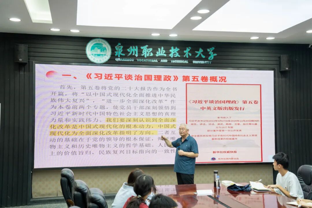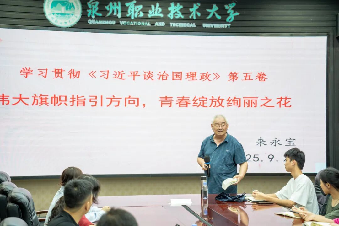 为深入学习贯彻《习近平谈治国理政》第五卷的关键要义,2025年9月24日晚 19:00,泉州职业技术大学校务顾问、马克思主义学院首席专家来永宝教授,在学校第一会议室以“伟大旗帜指引方向,青春绽放绚丽之花”为主题,为一善书院青马工程学员讲授专题思政课。本次课程以提升学生干部政治素养与工作能力为目标,旨在助力学员在学生组织中切实履行引领职责,进一步夯实理论根基。