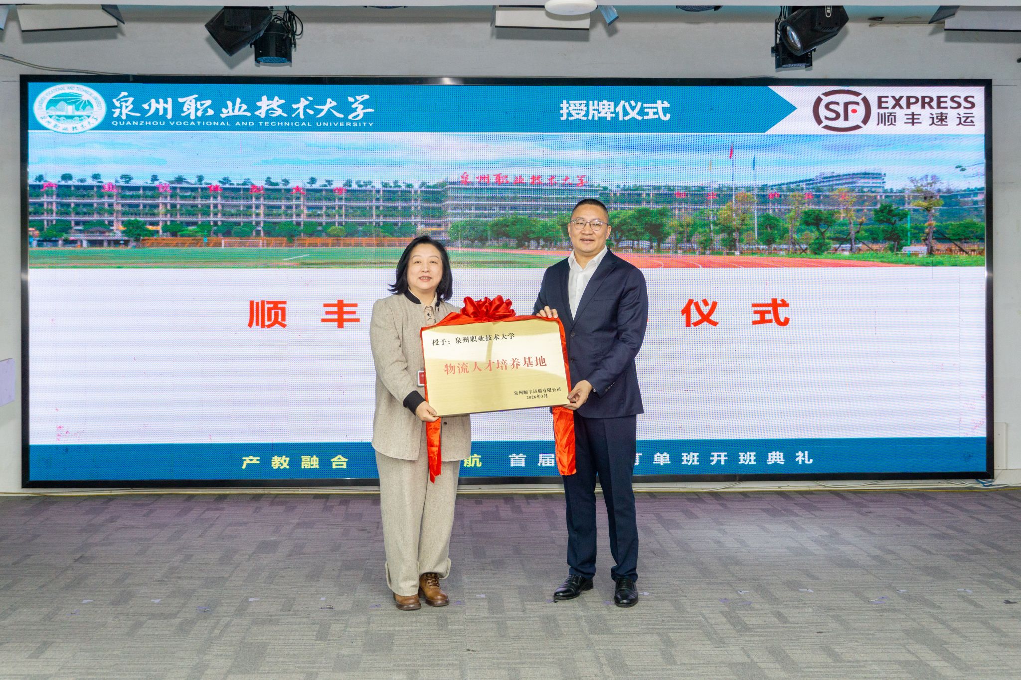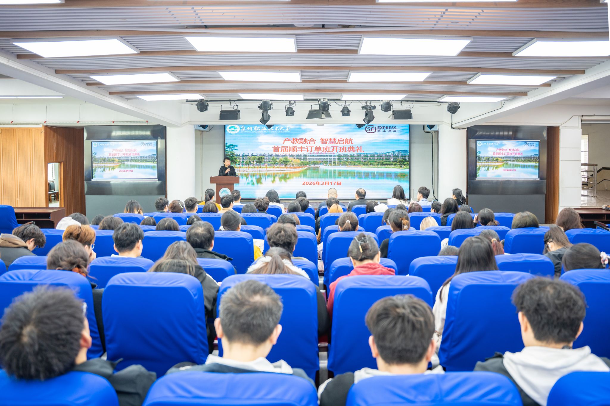 3月17日上午,泉州职业技术大学商学院与顺丰速运福建区联合举办的首届顺丰订单班开班典礼在学校举行。现代物流管理专业是我校国家双高计划电子商务专业群的核心组成专业,这次开班典礼是校企双方在此专业人才培养上的深度携手,标志着校企合作迈入产教融合新阶段。