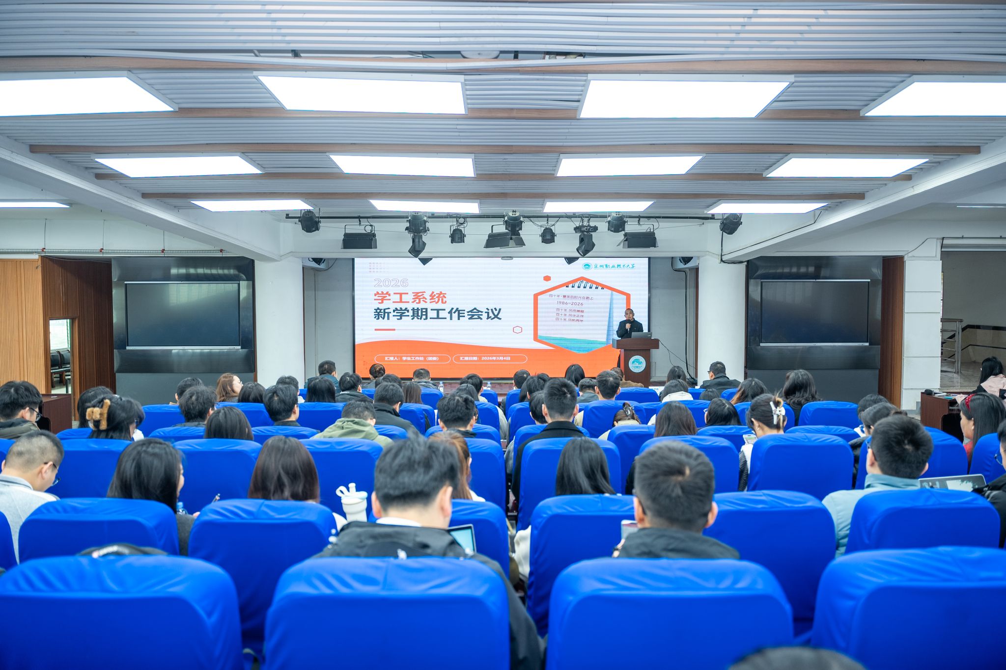 3月4日上午,我校召开2026年春季学期学生工作会议,校党委副书记、副校长蔡金佩,学生工作处、校团委、各书院部门负责人及全体辅导员参加会议。