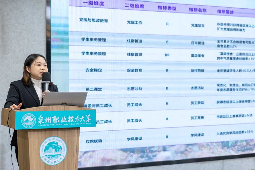 述职总结会上,吴滨如作《服务需求、深化产教城融合,提升关键办学能力》的主题报告,从“职业本科办学模式的思考”“产教城融合的探索与实践”“几点体会”三方面进行阐述,梳理学校扎根晋江、服务泉州、面向福建,主动对接服务区域产业发展和国家战略布局需求,围绕深化产教城融合,全速推进基于“产业伙伴型大学”和“市域产教联合体”双轮驱动的职业本科办学模式,推动学校高质量发展。她特别分享、解读了5个产教城融合的特色案例,分别是“以产定教”的省“双高”新一代信息技术专业群、“助产高端”的省“双高”智能装备制造专业群、“与产共荣”的国家“双高”电子商务专业群以及工艺美术专业群服务城市文旅产业、城市更新专业群服务未来城市建设,全面展示学校与城市、产业深度融合的实践探索及经验模式。