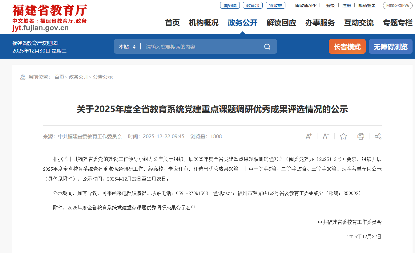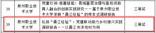 近日,福建省教育厅公布2025年度全省教育系统党建重点课题调研优秀成果评选结果。经严格评审,共评选出优秀成果50篇,其中我院课题调研报告《弘扬“晋江经验”:党建联动助力乡村振兴实践调研——以晋江市洋宅村为例》(作者:颜莉佳、张艺能),在全省众多参评成果中脱颖而出,荣获三等奖。