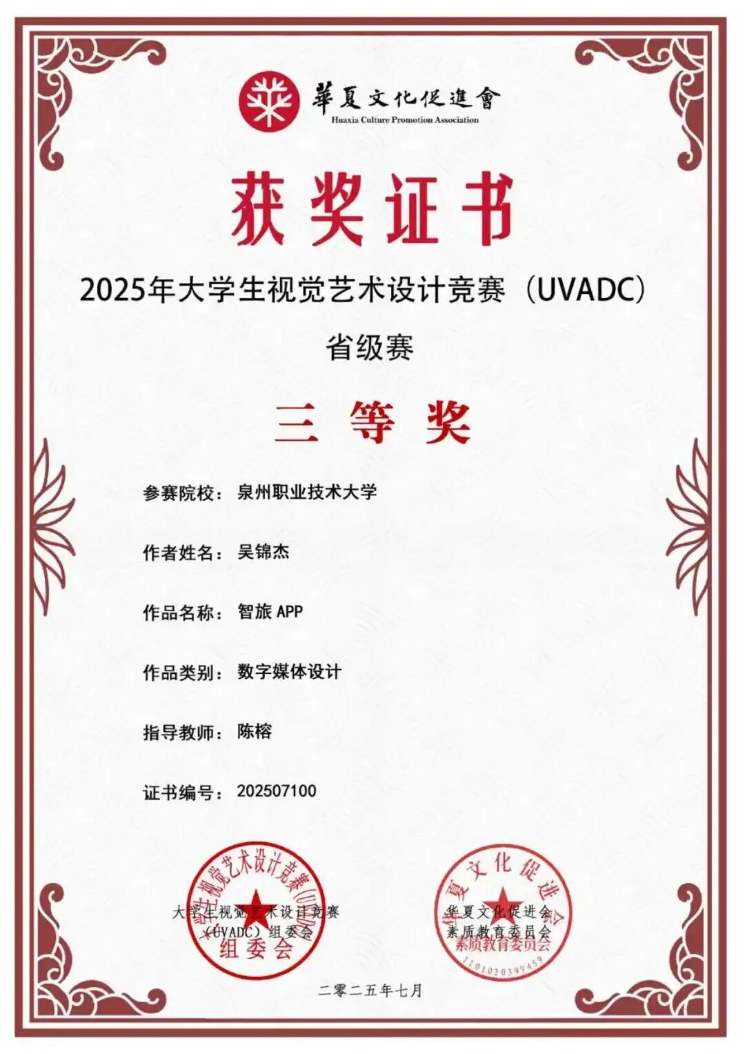 2025年07月 荣获大学生视觉艺术设计竞赛(UVADC)省级赛三等奖