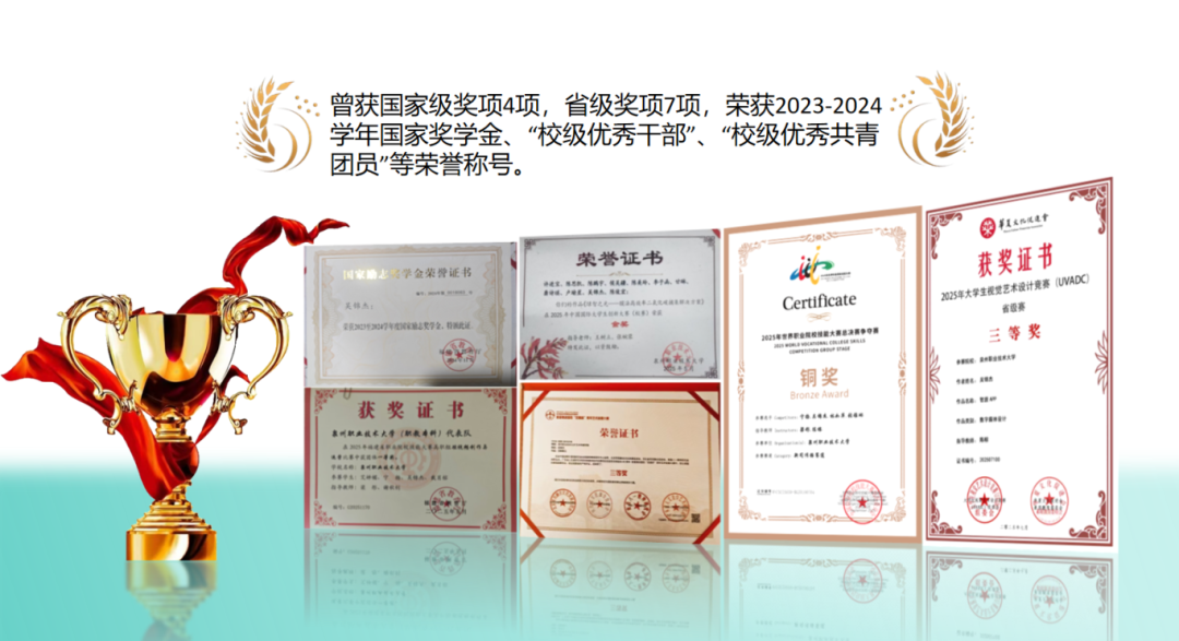 在2025年福建省职业院校技能大赛中,他主要负责视频特效制作与AE模块特效工程搭建,以精湛专业能力为团队赋能护航,先后助力团队斩获省赛一等奖、国赛铜奖。在ROCA平面与空间设计奖、真皮星尚我做主微视频公益大赛、真皮标志杯微视频动漫大赛等多项高水平赛事中,他作为团队核心主力,深度参与作品策划、创意构思与细节打磨,以匠心雕琢每一份作品,先后摘得赛事多项荣誉。他始终保持清醒与谦逊,将过往荣誉化为前行的不竭动力,在青春的赛道上奋力奔跑、永不止步。