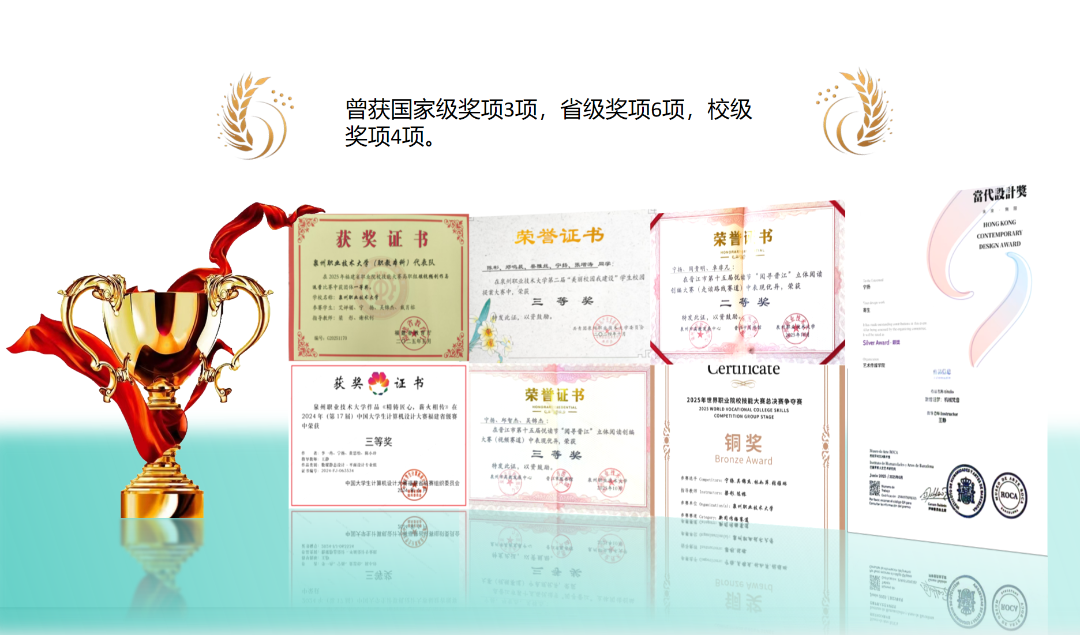 她积极参与专业竞赛,坚持以赛促学、以赛促练,将专业竞赛作为检验学习成果、提升专业能力的重要平台。备战福建省职业院校技能大赛期间,她与团队放弃暑假休息,顶着台风天前往泉州西街、南少林等八闽特色场景实地拍摄,累计素材超500G,反复打磨作品方案20余次,全力调试优化,最终斩获省级一等奖。凭借优异表现代表学校参加世界职业院校技能大赛,与全国优秀选手同台竞技,荣获国家级铜奖。此外,她还参与晋江市第十五届悦读节“阅寻晋江”立体阅读创编大赛,用镜头记录城市人文底蕴,荣获走读路线赛道二等奖、视频赛道三等奖,在实践中不断成长。
