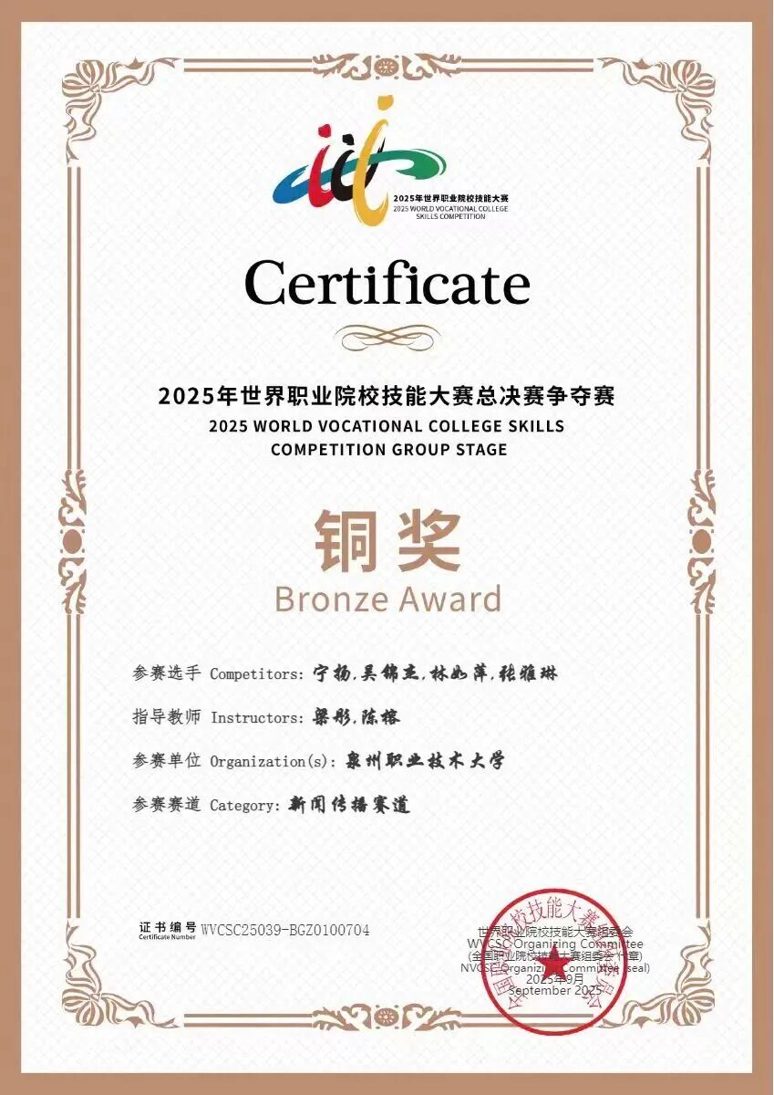 2025年09月 荣获2025年世界职业院校能大赛新闻传播赛道(高职组)三等奖