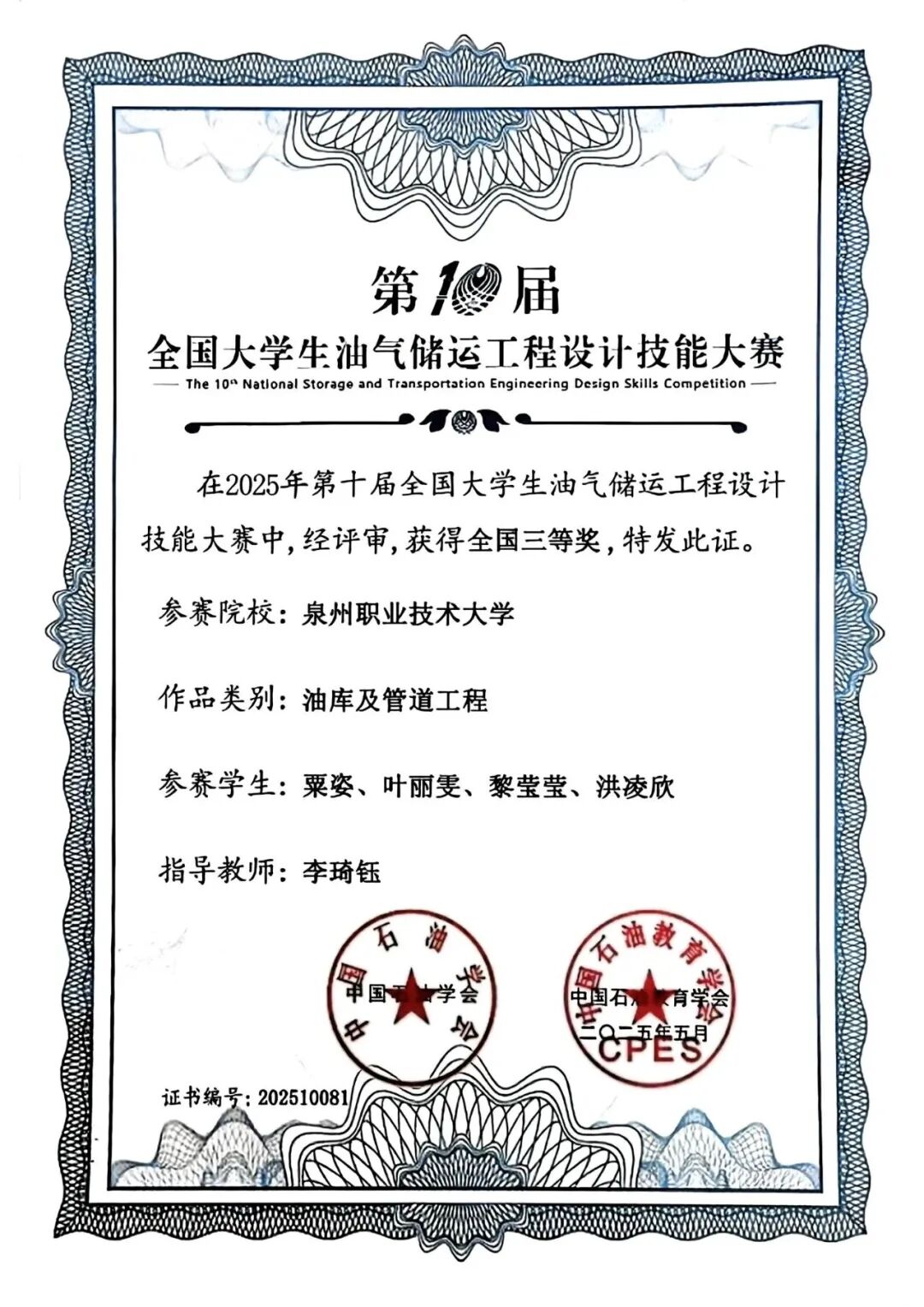2025年05月 荣获“第十届全国大学生油气储运工程设计技能大赛”全国三等奖