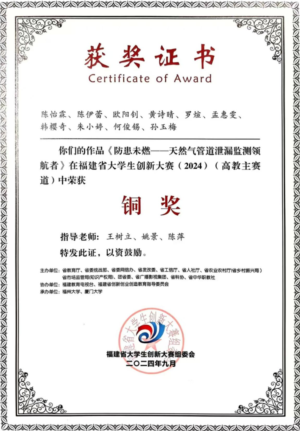 2024年09月 荣获福建省大学生创新大赛(2024)高教主赛道铜奖